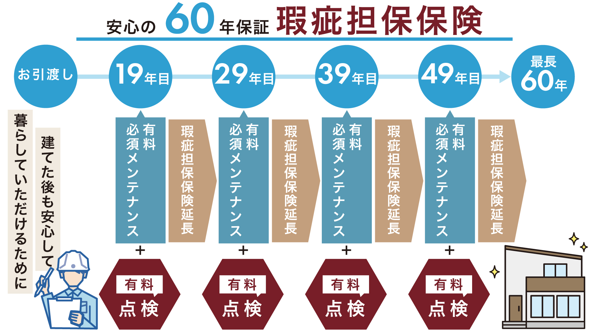お引渡し後19年目に、有料点検、および必須メンテナンス工事(有料)を行うことで、さらに10年間(お引渡しから最大60年間)の瑕疵担保保険に加入することができます。