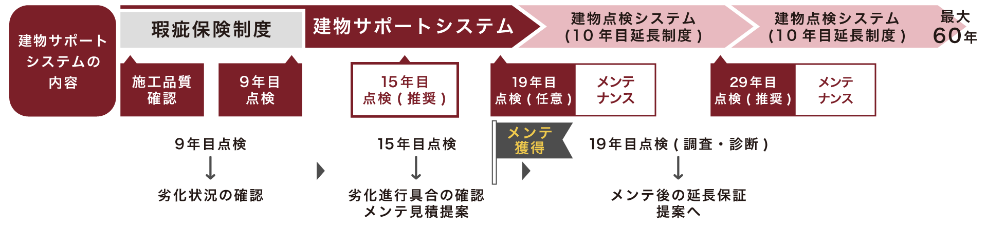 お引渡し後19年目に、有料点検、および必須メンテナンス工事(有料)を行うことで、さらに10年間(お引渡しから最大60年間)の瑕疵担保保険に加入することができます。